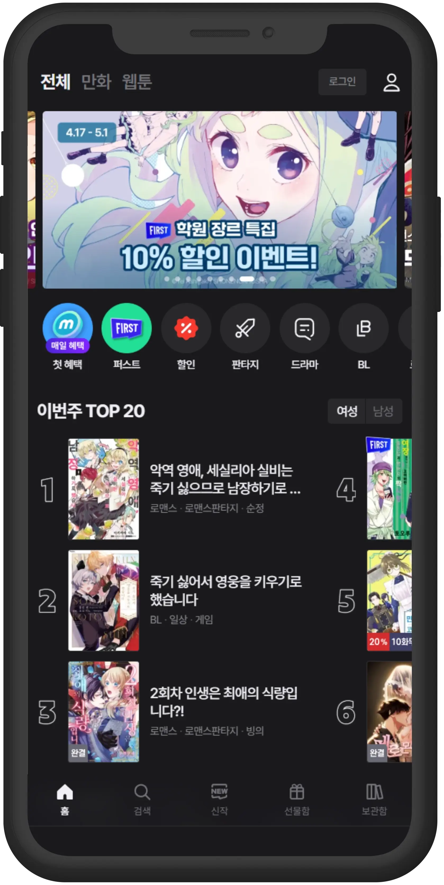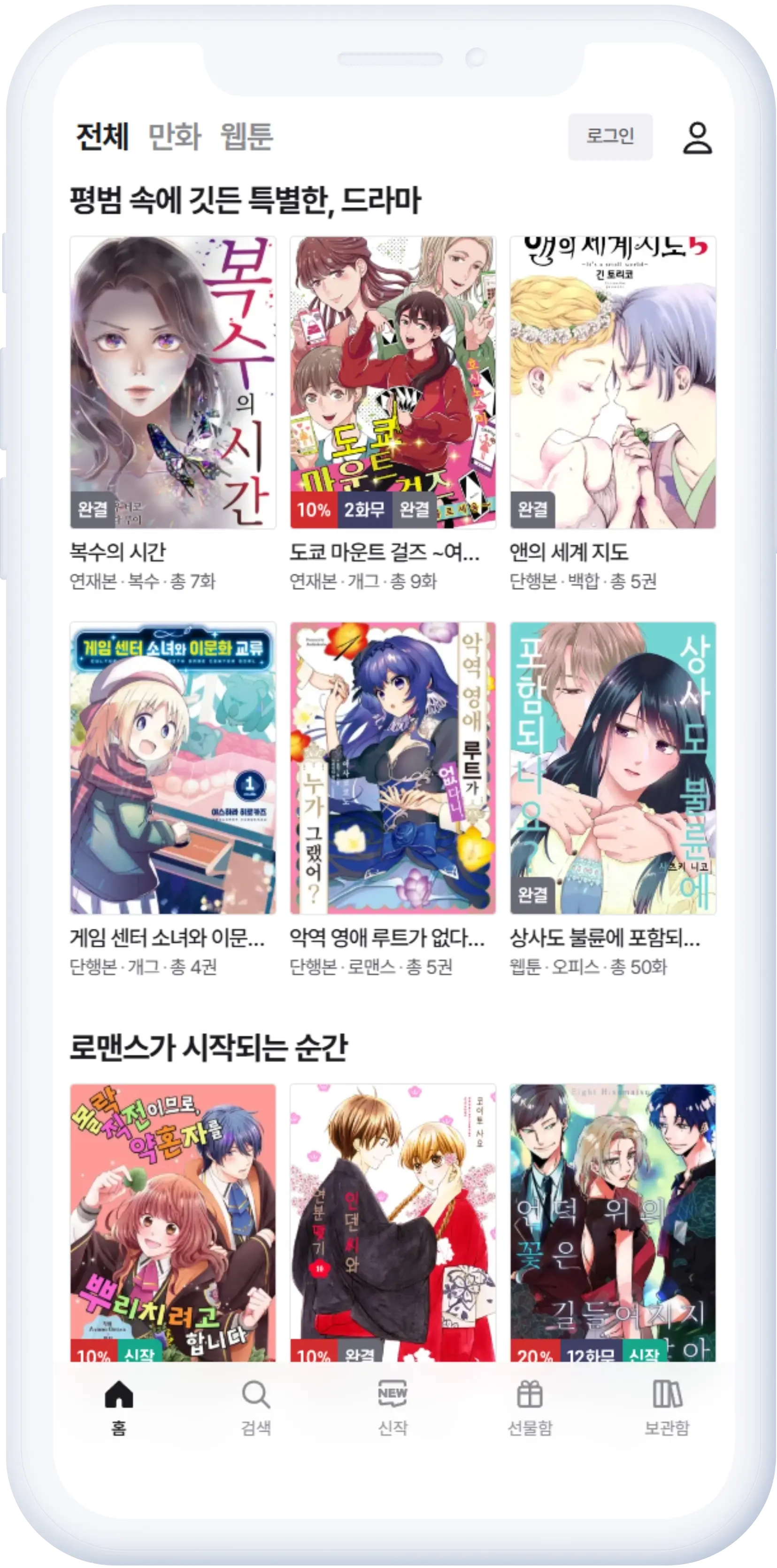 독점 IP와 동시 연재 시스템으로 압도적인 몰입감을 선사합니다. 만화·웹툰을 넘어 동인지, 라이트노벨까지 아우르는 종합 허브로 진화하고 있습니다.